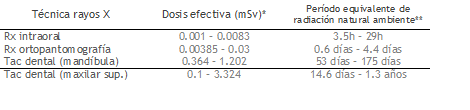 *Datos obtenidos del estudio: Victoria University of Manchester. Radiation Protection 136. European guidelines on radiation protection in dental radiology. Luxemburg: European Commission, 2004. http://ec.europa.eu/energy/nuclear/radiation_protection/doc/publication/136.pdf
